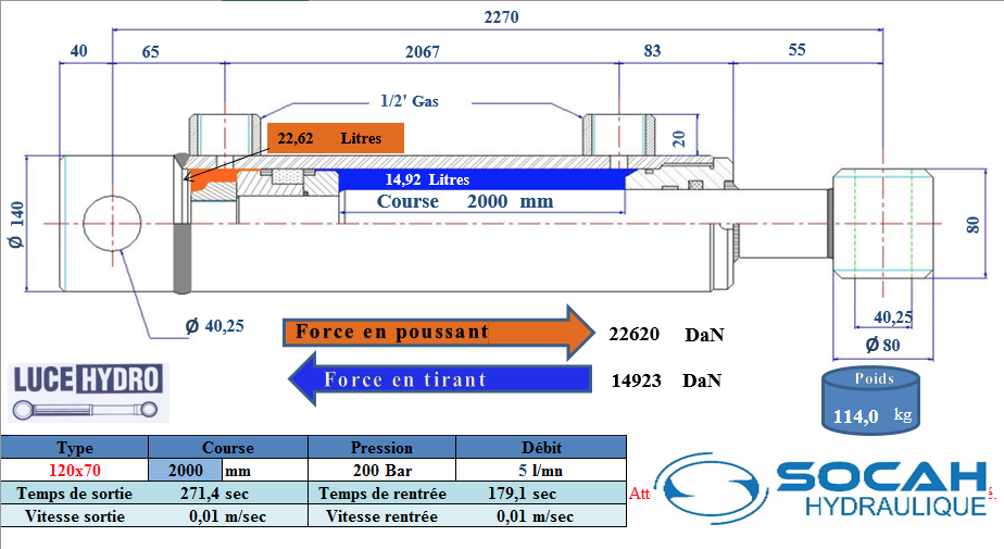 | Désignation | Vérin double effet standard Ø120x70 Course 2000 |