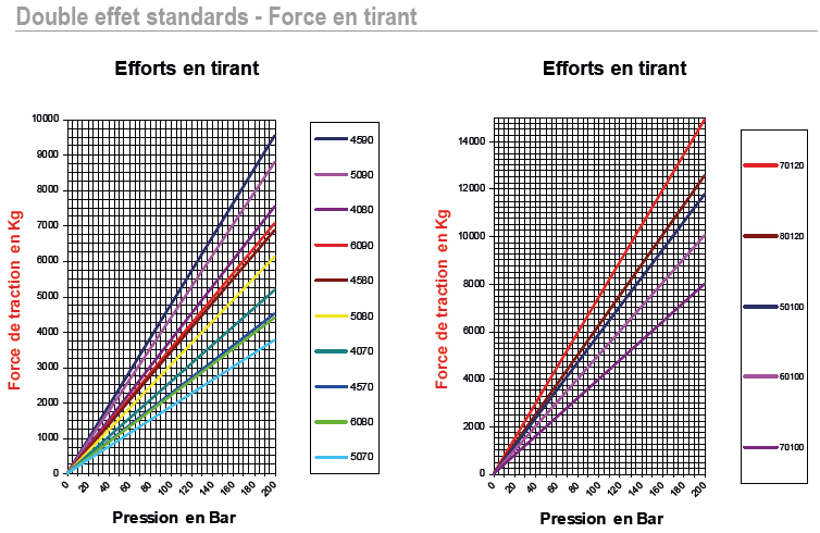 Pression de service : minimum 20 bar, maximum 200 bar, pour les vérins standards sous réserve de la limite de flambage (Option sur demande jusqu’à 350 bar). Vitesse maximum 0.5 m/sec. Température : -20°C à +90°C.