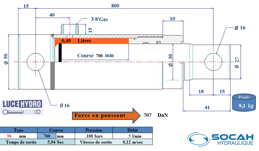 | Désignation | Vérin Simple effet standard Ø30 Course 700 |